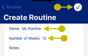 Creating a Routine is as simple as filling out the form and tapping on the checkmark icon in the top right of your screen. In order to create a Routine, you will need to provide a name and the number of weeks you would like your routine to span across.