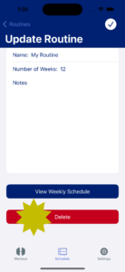 To Delete a Routine, tap on the delete button and confirm that you would like to delete the routine. This may be done from either the Routine List screen or from the update Routine view.